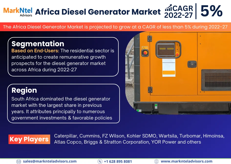 According to MarkNtel Advisors study The future of Africa Diesel Generator Market is projected to grow at a CAGR of less than 5% during the forecast period, i.e., 2022-27. The growth of the market is driven primarily by increasing infrastructural development projects for healthcare, hospitality, residential, commercial, & industrial, among other sectors, i.e.