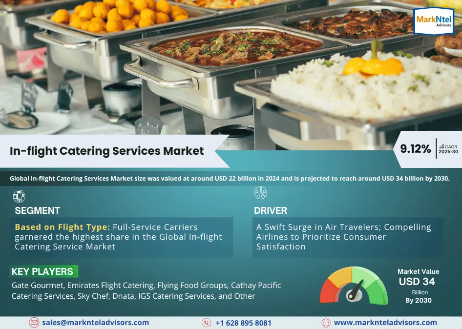 According to MarkNtel Advisors study The future of In-flight Catering Services Market size was valued at around USD 22 billion in 2024 and is projected to reach around USD 34 billion by 2030. Along with this, the market is anticipated to grow at a CAGR of around 9.12% during the forecast period, i.e., 2025-30.