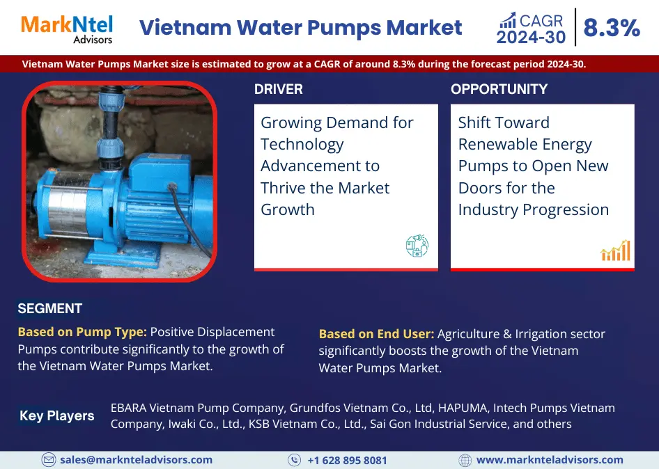 According to MarkNtel Advisors study The future of Vietnam Water Pumps Market size is estimated to grow at a CAGR of around 8.3% during the forecast period, i.e., 2024-30.