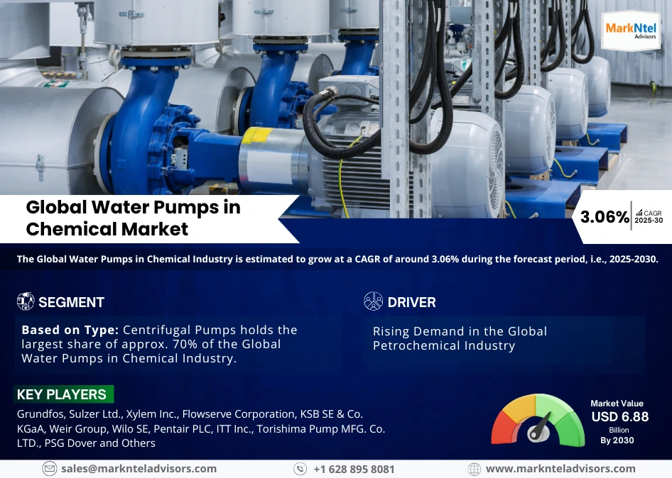 According to MarkNtel Advisors study The future of Water Pumps in Chemical Market size was valued at around USD 5.88 billion in 2024 and is projected to reach USD 6.88 Billion by 2030. Along with this, the market is estimated to grow at a CAGR of around 3.06% during the forecast period, i.e., 2025-2030.