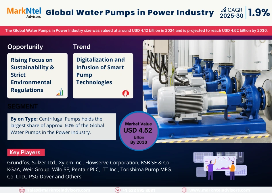 According to MarkNtel Advisors study The future of Water Pumps in Power Industry Market size was valued at around USD 4.12 billion in 2024 and is projected to reach USD 4.52 billion by 2030. Along with this, the market is estimated to grow at a CAGR of around 1.9% during the forecast period, i.e., 2025-30.