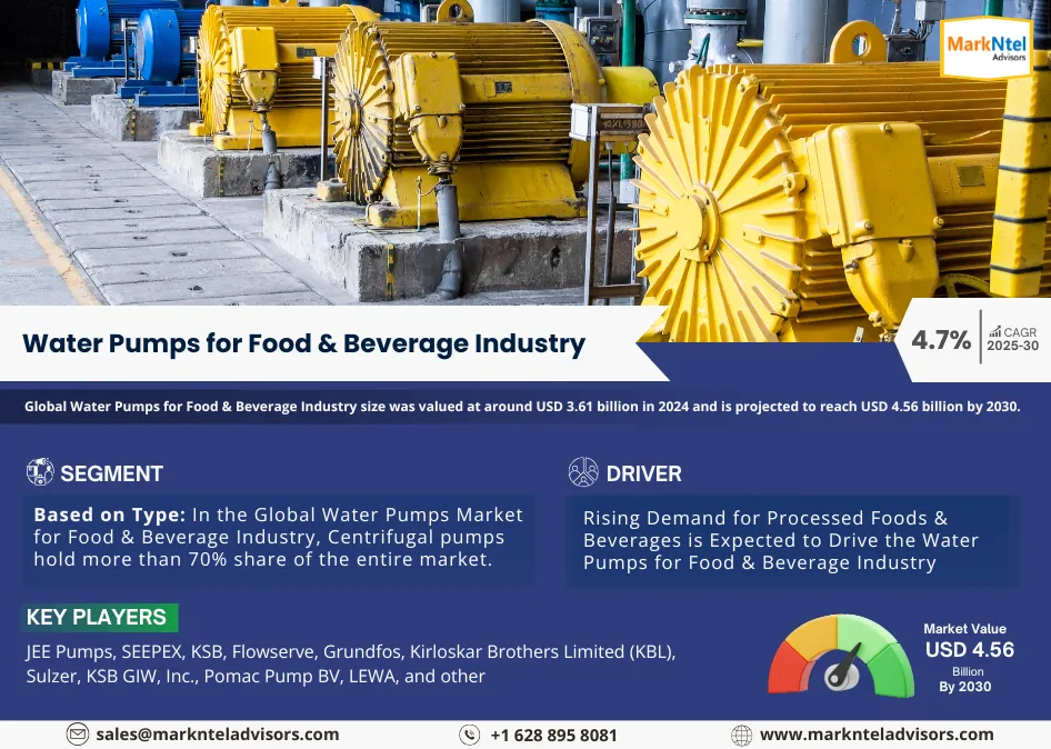 According to MarkNtel Advisors study The future of Water Pumps for Food & Beverage Industry Market size was valued at around USD 3.61 billion in 2024 and is projected to reach USD 4.56 billion by 2030. Along with this, the market is estimated to grow at a CAGR of around 4.7% during the forecast period, i.e., 2025-30.