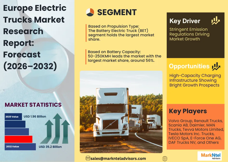 According to MarkNtel Advisors study The future of Europe Electric Trucks Market size is valued at around USD 1.96 billion in 2025 and is projected to reach USD 35.2 billion by 2032. Along with this, the market is estimated to grow at a CAGR of around 51.07% during the forecast period, i.e., 2026-32.