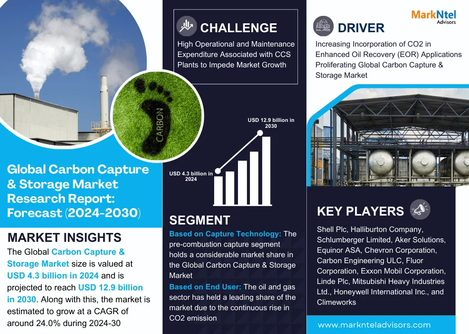 According to MarkNtel Advisors study The future of Carbon Capture & Storage Market size is valued at USD 4.3 billion in 2024 and is projected to reach USD 12.9 billion in 2030. Along with this, the market is estimated to grow at a CAGR of around 24.0% during the forecast period.