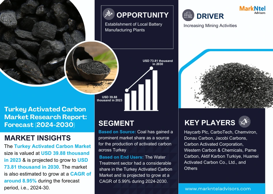 According to MarkNtel Advisors study The future of Turkey Activated Carbon Market size is valued at USD 39.88 thousand in 2023 & is projected to grow to USD 73.81 thousand in 2030. The market is also estimated to grow at a CAGR of around 8.95% during the forecast period, i.e., 2024-30.