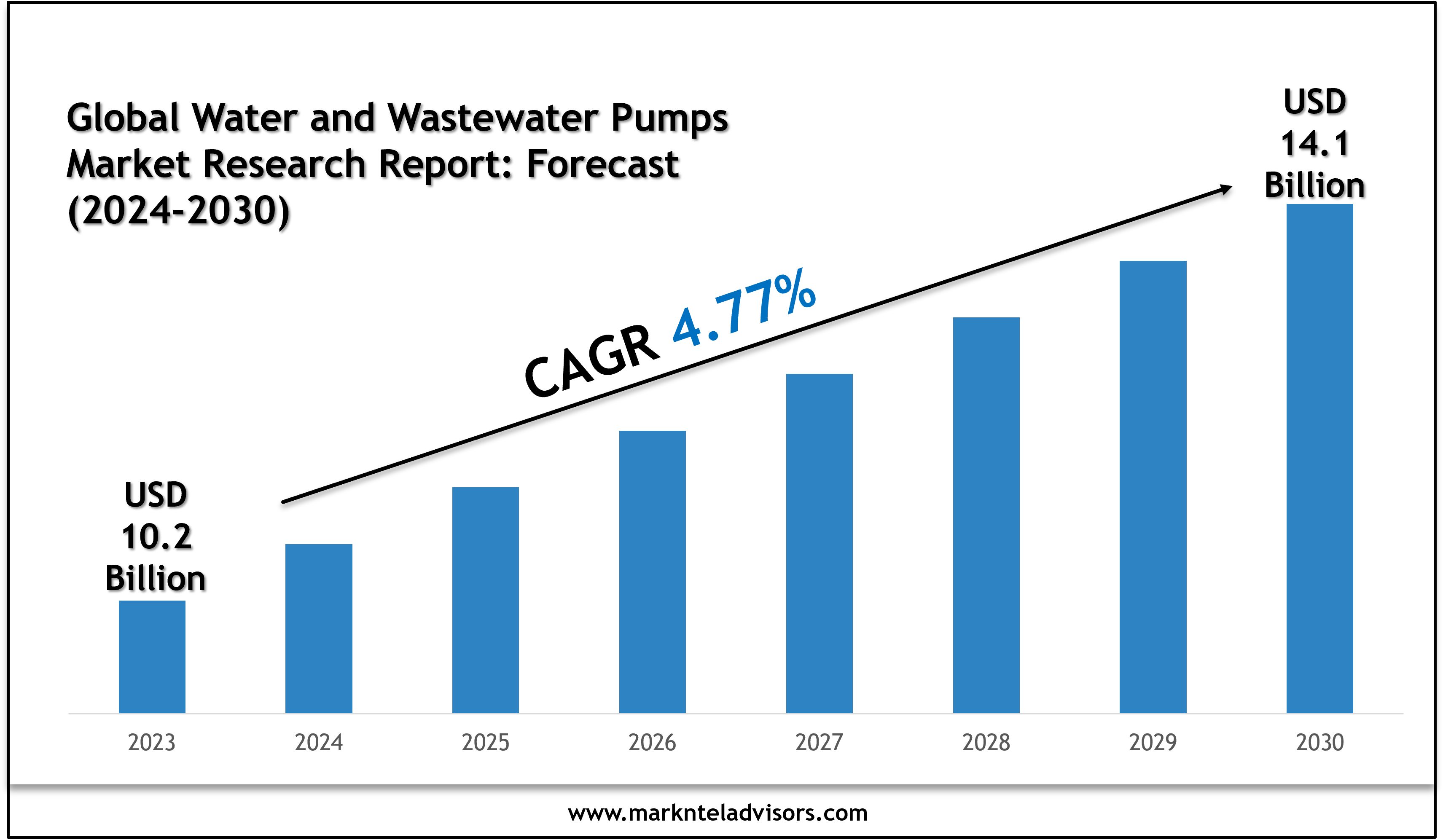 The Global Water & Wastewater Pumps Market size is valued at USD 10.2 billion in 2023 & is estimated to reach USD 14.1 billion by 2030. Along with this, the market is projected to grow at a CAGR of around 4.77% during the forecast period, i.e., 2024-30. The industry growth imputes to the growing clean water demand, technological advancement, widening oil & gas industry, and rapid urbanization globally. According to the United Nations Environment Program (UNEP) 2023, around 6 billion consumers would face water scarcity by 2050 due to climate change, pollution, and increasingly unsustainable consumption & production.