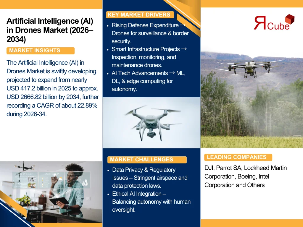 According to the latest report by The Report Cube, study Artificial Intelligence (AI) in Drones Market is swiftly developing, projected to expand from nearly USD 417.2 billion in 2025 to approx. USD 2666.82 billion by 2034, further recording a CAGR of about 22.89% during 2026-34.