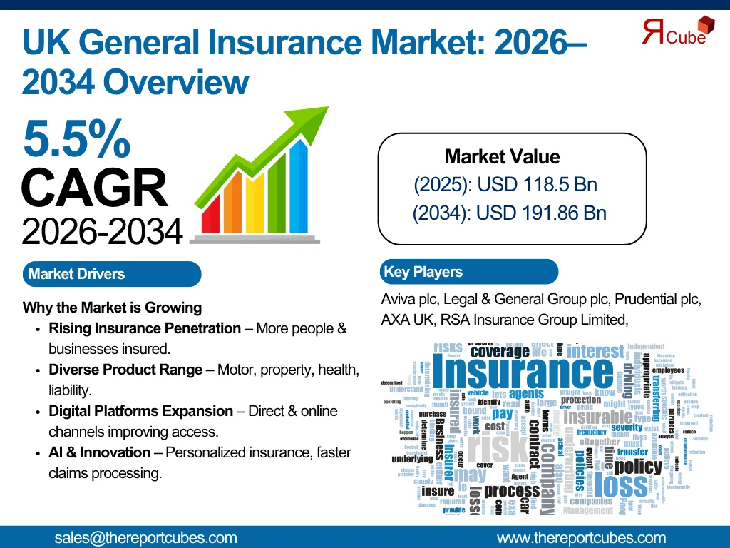 According to the latest report by The Report Cube, study UK General Insurance Market is anticipated to register a CAGR of around 5.5% during the forecast period, 2026-34. Additionally, the market size was valued at nearly USD 118.5 billion in 2025 and is projected to reach nearly USD 191.86 billion by 2034.