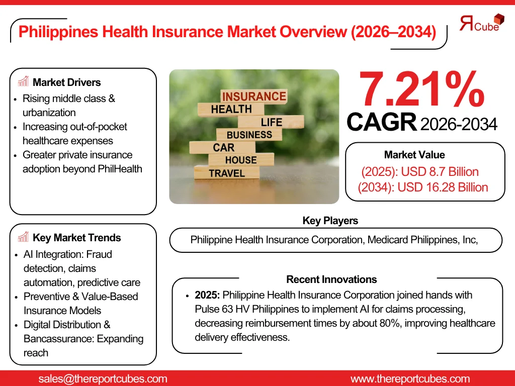 According to the latest report by The Report Cube, study Philippines Health Insurance Market is anticipated to register a CAGR of around 7.21% during the forecast period, 2026-34. Additionally, the market size was valued at nearly USD 8.7 billion in 2025 and is projected to reach nearly USD 16.28 billion by 2034.