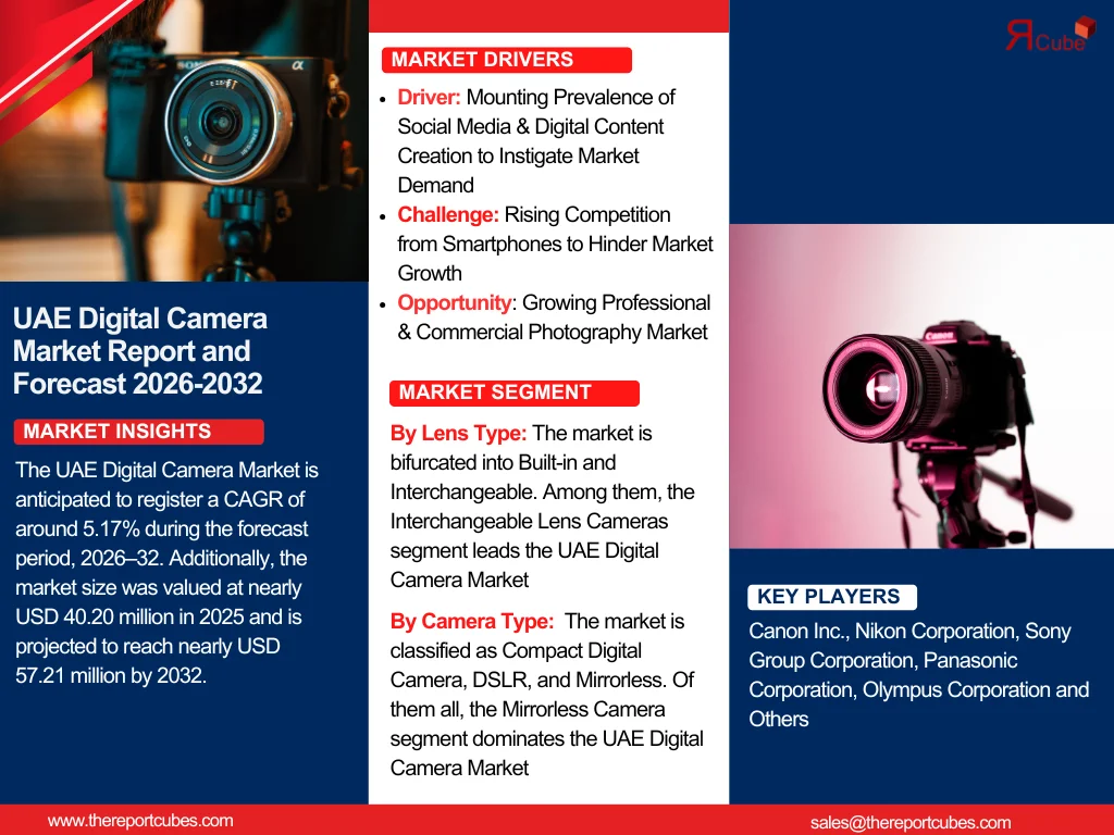 According to the latest report by The Report Cube, study UAE Digital Camera Market is anticipated to register a CAGR of around 5.17% during the forecast period, 2026–32. Additionally, the market size was valued at nearly USD 40.20 million in 2025 and is projected to reach nearly USD 57.21 million by 2032.