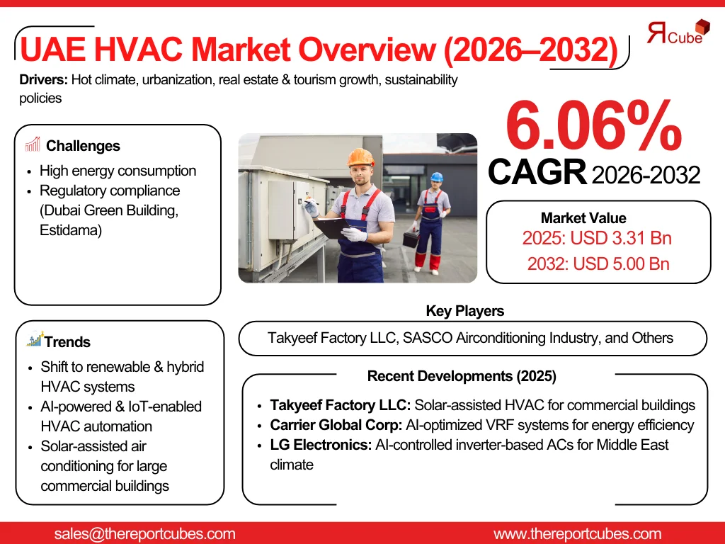 According to the latest report by The Report Cube, study UAE HVAC Market is anticipated to register a CAGR of around 6.06% during the forecast period, 2026–32. Additionally, the market size was valued at nearly USD 3.31 billion in 2025 and is projected to reach nearly USD 5.00 billion by 2032.