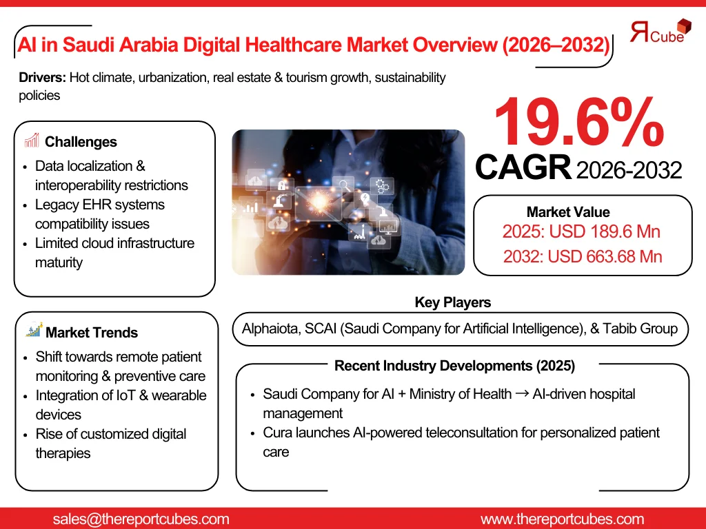 According to the latest report by The Report Cube, study AI in Saudi Arabia Digital Healthcare Market is projected to witness significant expansion, registering a CAGR of around 19.6% during 2026–2032. Also, the market size is valued at nearly USD 189.6 million in 2025 and is expected to reach USD 663.68 million by 2032.