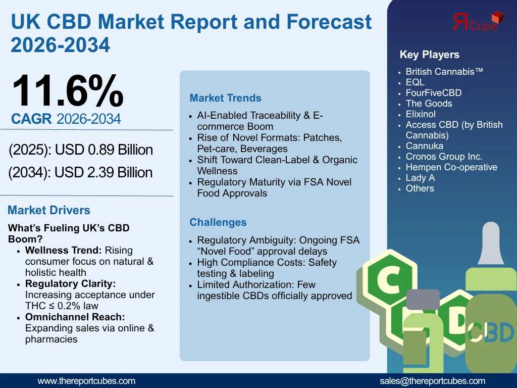 According to the latest report by The Report Cube, study UK CBD Market is anticipated to register a CAGR of around 11.6% during the forecast period, 2026-34. Additionally, the market size was valued at nearly USD 0.89 billion in 2025 and is projected to reach nearly USD 2.39 billion by 2034.