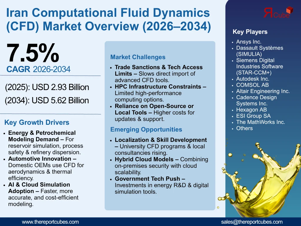 According to the latest report by The Report Cube, study Iran Computational Fluid Dynamics Market is anticipated to register a CAGR of around 7.5% during the forecast period, 2026-34. Additionally, the market size was valued at nearly USD 2.93 billion in 2025 and is projected to reach nearly USD 5.62 billion by 2034.