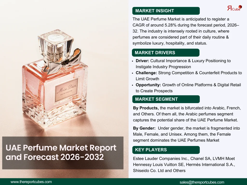 According to the latest report by The Report Cube, study UAE PERFUME Market is anticipated to register a CAGR of around 5.28% during the forecast period, 2026–32. The market size was valued at nearly USD 1366.4 million in 2025 and is foreseen to reach USD 1958.84 million by 2032.