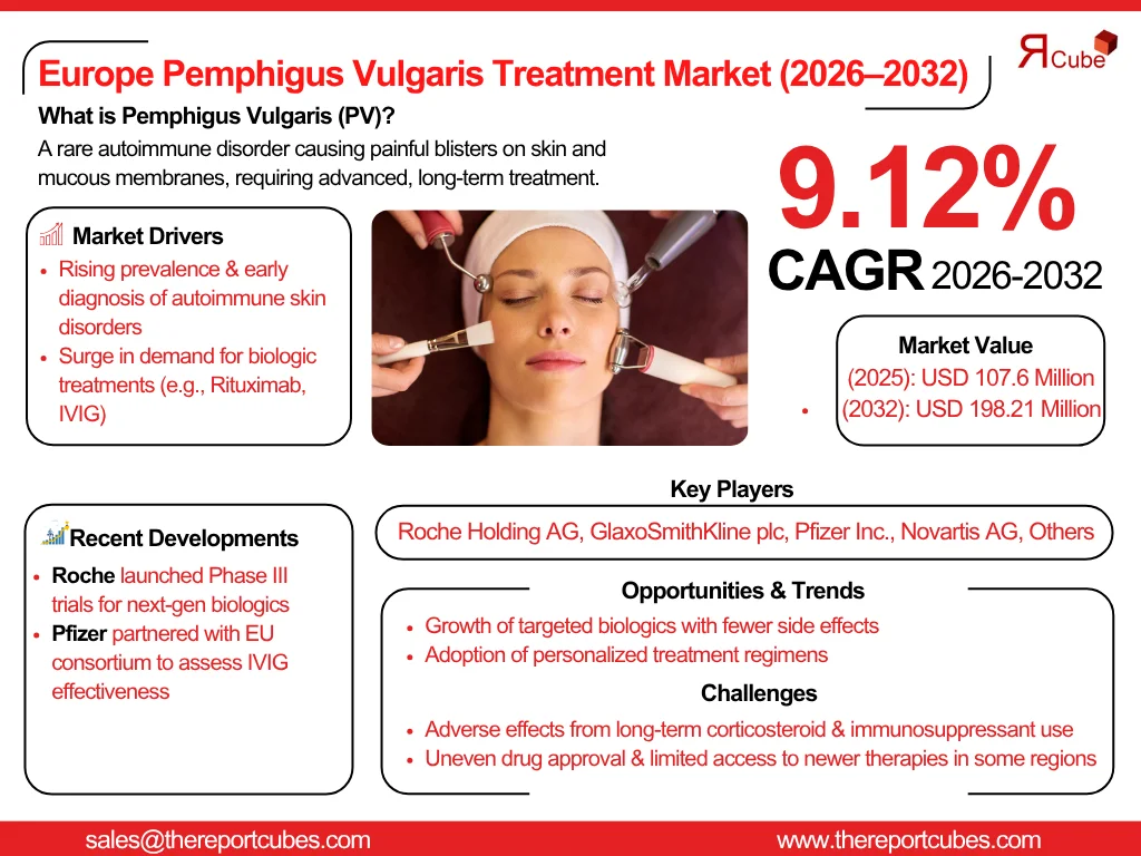 According to the latest report by The Report Cube, study Europe Pemphigus Vulgaris Treatment Market is anticipated to register a CAGR of around 9.12% during the forecast period, 2026-32. Also, the market size is valued at nearly USD 107.6 million in 2025 and is foreseen to witness nearly USD 198.21 million during 2032.