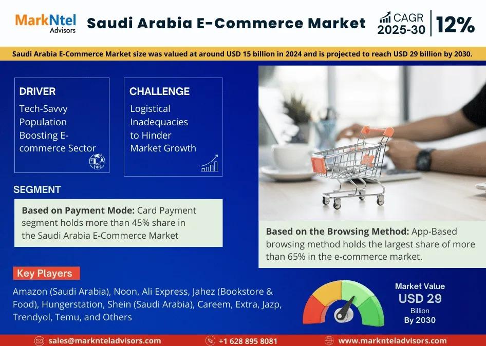 As per MarkNtel Advisors the Saudi Arabia E-Commerce Market size was valued at around USD 15 billion in 2024 and is projected to reach USD 29 billion by 2030. Along with this, the market is estimated to grow at a CAGR of around 12% during the forecast period, i.e., 2025-30. This growth in the market is largely due to the strong and expanding digital infrastructure of the country. The kingdom has a massive internet penetration of around 99% and a cellular mobile connection of over 49 million in 2024. Additionally, the kingdom is witnessing rapid expansion in digital payments due to accelerating growth in its fintech sector.