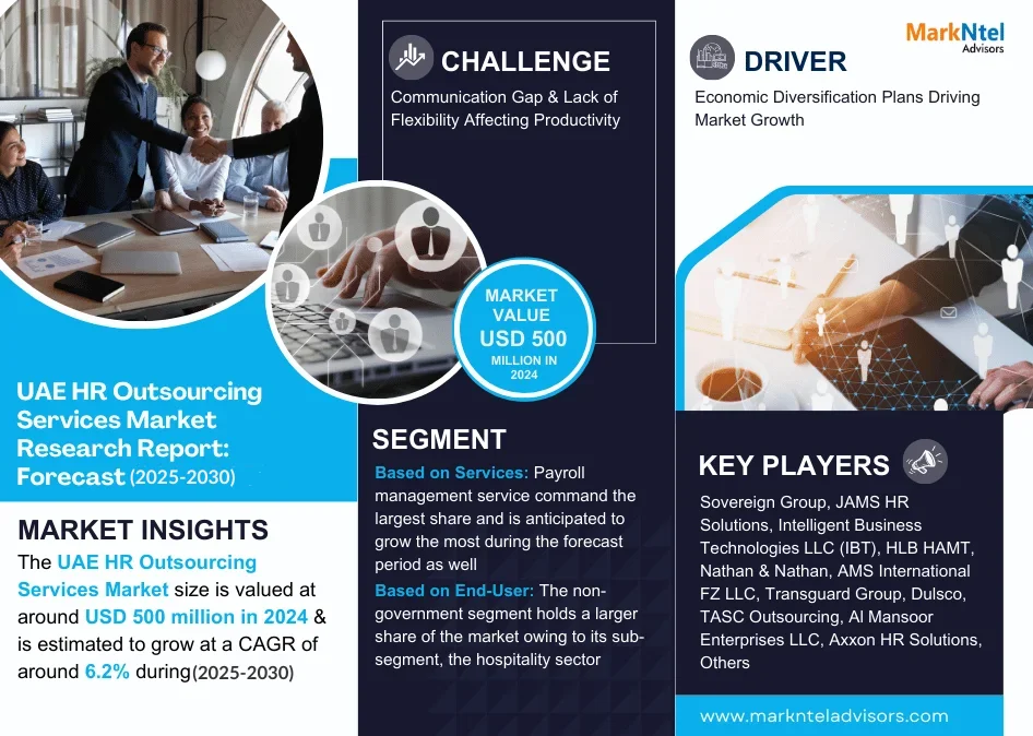 As per MarkNtel Advisors the UAE HR Outsourcing Services Market size is valued at around USD 500 million in 2024 & is estimated to grow at a CAGR of around 6.2% during the forecast period, i.e., 2025-30. The fast-growing economy of the UAE is the primary factor behind the growth of the HR outsourcing services industry in the country.