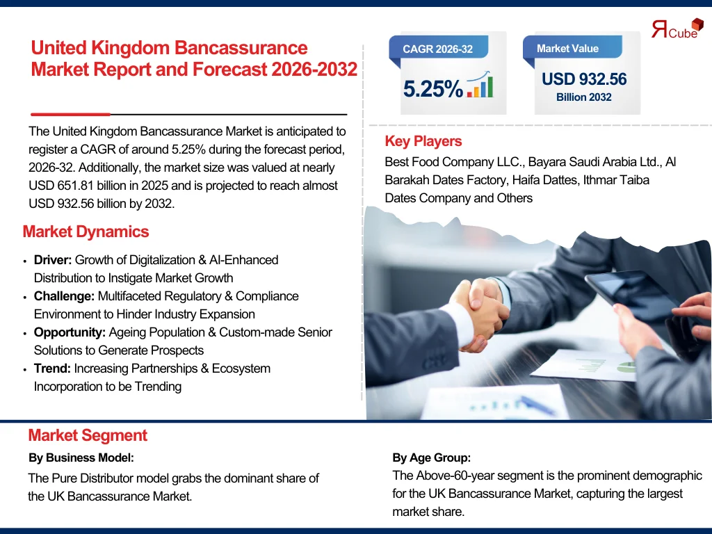 According to the latest report by The Report Cube, study United Kingdom Bancassurance Market is anticipated to register a CAGR of around 5.25% during the forecast period, 2026-32. Additionally, the market size was valued at nearly USD 651.81 billion in 2025 and is projected to reach almost USD 932.56 billion by 2032. The expansion of the industry is being driven by multiple interlinked aspects, particularly the surging digitalization of banking & insurance services, demographic changes, and developing consumer preferences.