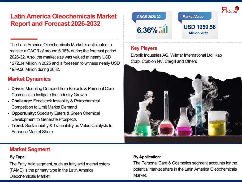 According to the latest report by The Report Cube, study Latin America Oleochemicals Market is anticipated to register a CAGR of around 6.36% during the forecast period, 2026-32. Also, the market size was valued at nearly USD 1272.34 Million in 2025 and is foreseen to witness nearly USD 1959.56 Million during 2032.