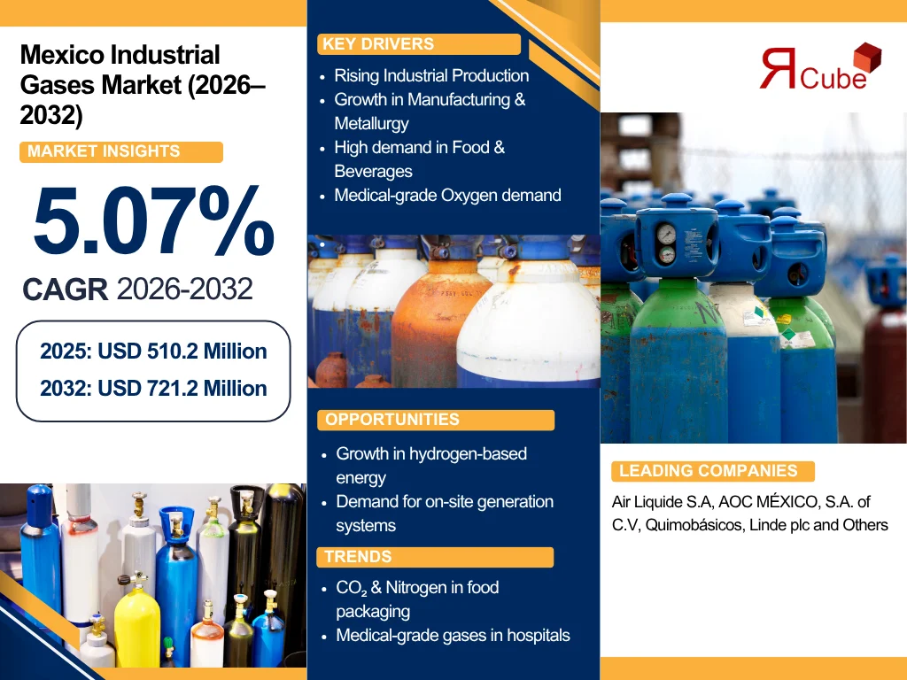 According to the latest report by The Report Cube, study Mexico Industrial Gases Market is anticipated to register a CAGR of around 5.07% during the forecast period, 2026-32. Also, the market size was valued at nearly USD 510.2 Million in 2025 and is foreseen to witness nearly USD 721.2 Million during 2032.