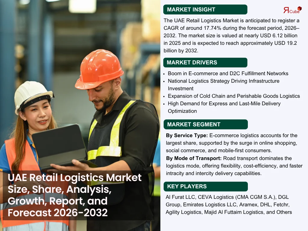 According to the latest report by The Report Cube, study UAE Retail Logistics Market is anticipated to register a CAGR of around 17.74% during the forecast period, 2026–2032. The market size is valued at nearly USD 6.12 billion in 2025 and is expected to reach approximately USD 19.2 billion by 2032.