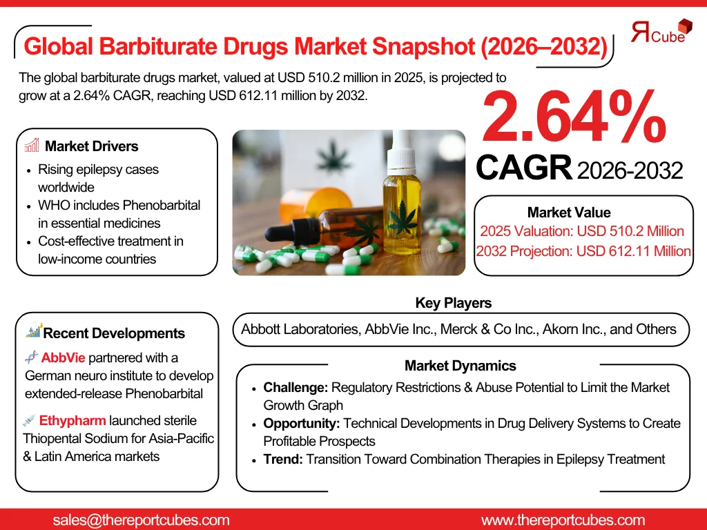 According to the latest report by The Report Cube, study Barbiturate Drugs Market is anticipated to register a CAGR of around 2.64% during the forecast period 2026–2032. The market was valued at approximately USD 510.2 Million in 2025, and is expected to reach nearly USD 612.11 Million by 2032. The key purposes of barbiturates, a class of central nervous system depressants, are sedation, induction of anesthesia, and seizure control. Barbiturate medications are still essential in surgical procedures & medical emergencies, even if the world is shifting toward safer alternatives such as benzodiazepines.