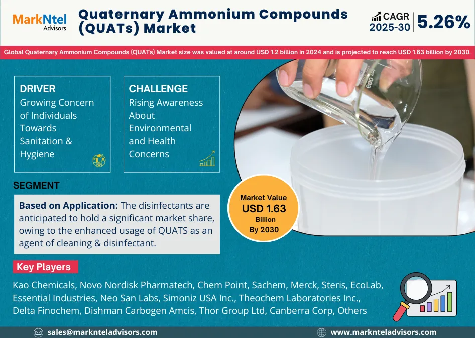 MarkNtel Advisors, a leading market research and consulting firm, has announced the release of its latest study titled Quaternary Ammonium Compounds (QUATs) Market Research Report: Forecast (2025–2030). This report provides a detailed assessment of the Quaternary Ammonium Compounds (QUATs) Market, covering its evolving dynamics, emerging trends, key growth drivers, major challenges, and competitive landscape.
