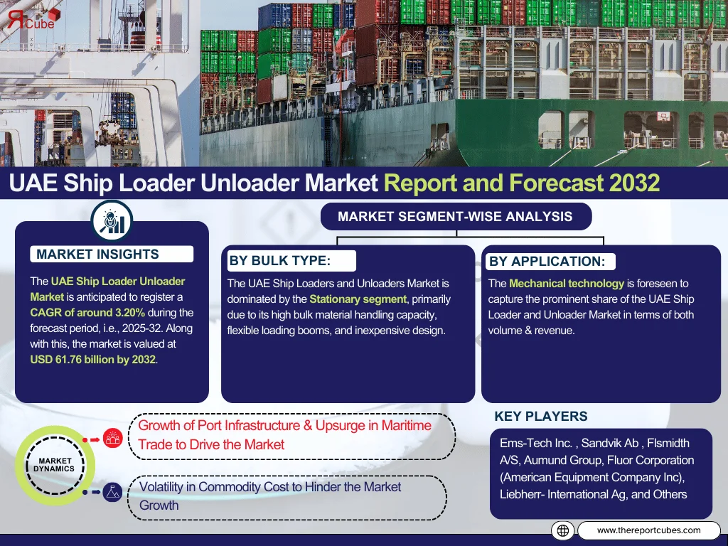 The UAE Ship Loader Unloader Market is anticipated to register a CAGR of around 3.20% during the forecast period, 2025-32. Also, the market size was valued at nearly USD 49.54 billion in 2025 and is foreseen to witness nearly 61.76 billion during 2032. Owing to the UAE’s strategic location as a hub for international trade & its big port infrastructure investments, the ship loader & unloader enterprises are expanding considerably.