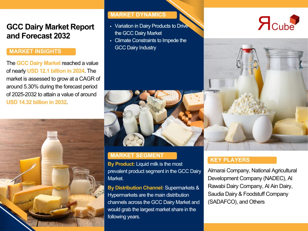 The GCC Dairy Market reached a value of nearly USD 12.1 billion in 2024. The market is assessed to grow at a CAGR of around 5.30% during the forecast period of 2025-2032 to attain a value of around USD 14.32 billion in 2032. The market delivers a wide range of products, like butter, milk, yogurt, cheese, and other various dairy-based items, made from the milk of cows, goats, camels, and others.