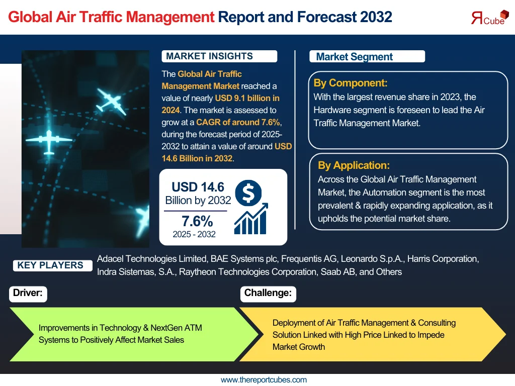 The Global Air Traffic Management Market reached a value of nearly USD 9.80 billion in 2025. The market is assessed to grow at a CAGR of around 7.6%, during the forecast period of 2025-2032 to attain a value of around USD 16.44 Billion in 2032. Advanced technologies, such as automation, data networking, and satellite-based navigation are utilized by NextGen ATM systems to alter how airplanes fly & interact with one another in the air.