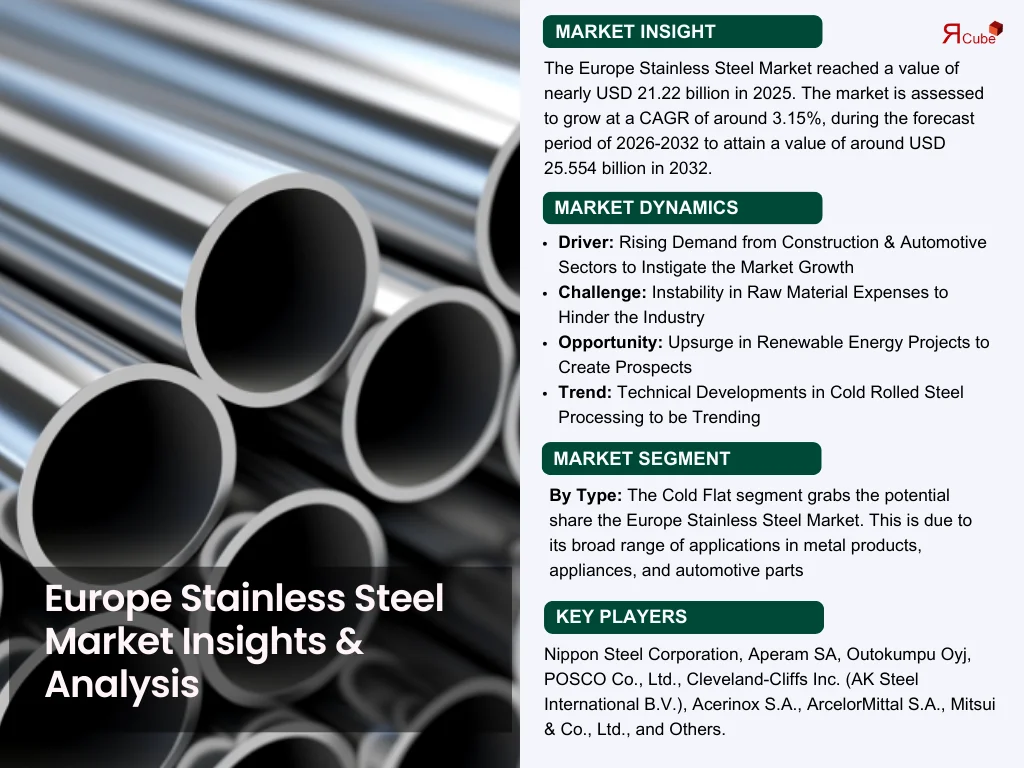 https://www.thereportcubes.com/report-store/europe-stainless-steel-marketEurope Stainless Steel Market Analysis 2026–2032: Production, Consumption, and Regional Insights Market Size (2025): USD 21.22 Billion Market Size (2032): USD 25.554 Billion CAGR (2026–2032): 3.15% Top Companies in Europe Stainless Steel Market: Nippon Steel Corporations, Aperam SA, Outokumpu Oyj, POSCO Co., Ltd., Cleveland-Cliffs Inc. (AK Steel International B.V.), Acerinox S.A., ArcelorMittal S.A., Mitsui & Co., Ltd., Others. https://www.thereportcubes.com/report-store/europe-stainless-steel-market0 التعليقات 0 المشاركات 12 مشاهدة -